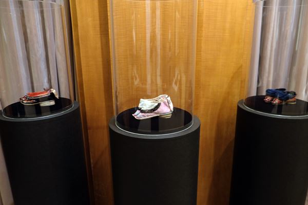 人類は、その歴史のなかで美しさを追求するあまり、ときには身体に無理をかけて理想の形に近づけていくこともあった。続く第2章「歴史にみる奇想のモード」では、極端にウエストの細いコルセットや、足を著しく変形させる纏足靴など、美のために人間の形状とかけはなれてしまった衣服や靴を紹介するほか、当時の着せかえ人形や資料を紹介する。