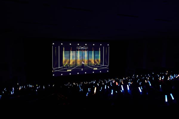 4曲の披露が終わると、軽い自己紹介MCが。冒頭からテンションが上がりすぎて片耳のイヤホンを落としたエピソードが語られたり、3会場に声掛けが行われたりと、会場は終始楽しい空気。ときのそらのライブだからこそ、生み出されたその雰囲気のまま、「グッバイ宣言」「ファンサ」「冴えない自分にラブソングを」「シル・ヴ・プレジデント」の4曲が披露された。「グッバイ宣言」「シル・ヴ・プレジデント」の2曲は『Re:Play』には収録されていなかった楽曲。歌いながらみせてくれる、ときのそらのアクションはキュートで、会場内では彼女のアクションに応えてペンライトの光が踊り、そらとも(ファンの呼称)と、ときのそらの阿吽の呼吸が会場内に呼応し、それは気持ちよいひと時だった。