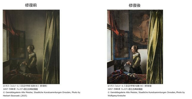 本展では、大規模な修復プロジェクトによってキューピッドの画中画が現れ、フェルメールが描いた当初の姿となった『窓辺で手紙を読む女』が、所蔵館であるドレスデン国立古典絵画館のお披露目に続いて公開される。