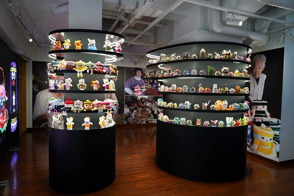 プレゼンテーションルームのような会場構成で、おかんアートの見え方が変わる。「おかんアートタワー」には、毛糸やビーズから軍手、チラシなど日常にありふれた素材でつくられた作品の数々が並ぶ。作品1点1点を端正に撮影した写真や、おかんアーティストのポートレートが、壁一面に堂々と展示されている。