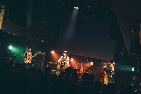 続いては大阪を拠点に瑞々しくも切ない青春ロックを鳴らし続ける女性3人組バンド・カネヨリマサル。ボーカル・ギターちとせみなの「精一杯届けます」という言葉どおり、音楽にすべてを込めるような全身全霊のパフォーマンス。切ない失恋や過去を歌った曲が多いのだが、そういう曲でさえ、こうしてバンドで鳴らされ放たれると、なぜか前向きで明るい響きを帯びるから不思議だ。メンバー3人も時折視線を合わせては笑顔を覗かせていた。