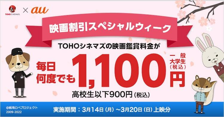 TOHOシネマズ×au、毎日映画を1100円で楽しめる映画割引キャンペーン実施