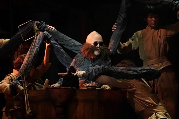映像やイリュージョンに頼ることなく、パペットや衣裳の力でそれを実現している時点で既に、「演劇ならではの表現」となっていることは明らか。だが、それだけではない。パペットの操り手が隠れることなく、歌舞伎の黒衣のように観客から見える趣向になっていたり。カオナシの心情や「油屋」で働く湯女たちの作業が、時にダンスで表現されたり。そして美術も、能舞台を思わせるセットが360°回転することであらゆる場面を象徴的に表しており、実に演劇的だ。おまけにオーケストラの生演奏までついて、ライブ感を味わいながらイマジネーションを働かせて楽しめる、まさに演劇の醍醐味に満ちた舞台と言えるだろう。