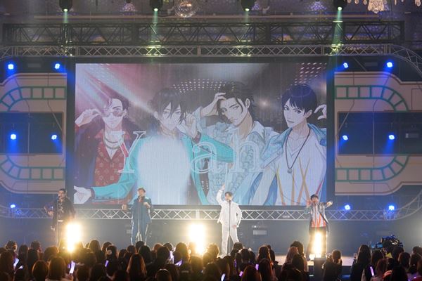 和の心をコンセプトにしたユニット・森嶋 秀太(和泉 オーキッド 亜恋役・高輪ゲートウェイ駅)、高塚 智人(英 皐月役・駒込駅)、井上 雄貴(高岩 大智役・巣鴨駅)が満開の桜を思わせる、妖艶さも感じる振り付けとともに「花びら舞う夜に」を披露すると、代わって高橋 英則(饗庭 紡麦役・恵比寿駅)、三浦 祥朗(伍代 晃役・五反田駅)、小山 剛志(羽振 寿里役・田町駅)、菅沼 久義(大崎 新市役・大崎駅)によるアダルティな魅力が光るユニットが、ミラーボールが輝くなか「Sparkling Night」を歌唱。場内は夜の東京を思わせるような大人の空間に早変わりした。
