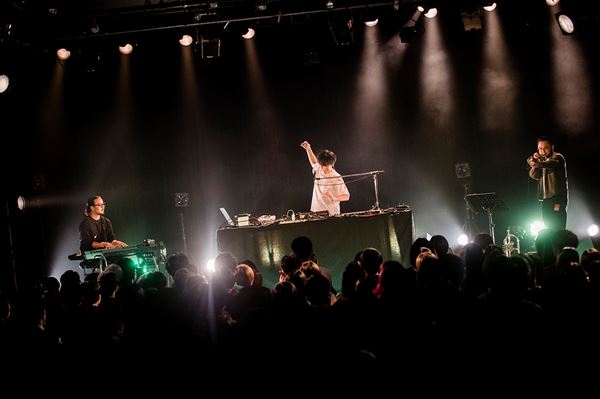 最初は、ゲストのSTUTSのライブから。ステージ中央にMPCやシンセ等の機材に囲まれたSTUTS、左にキーボードのTAIHEI、右にトランペットの佐瀬祐輔、という3人編成で、身体も床もブルブル震わせるほどの(比喩ではなく実際に震える)、もんのすごいキック音の「Intro」と、続く「Ride」で、ライブがスタート。