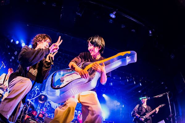 アンコールで再びメンバーが現れると、「無事にファイナル終わった」(玉屋)、「3カ所、めちゃくちゃ楽しかった!」(∴560∵)、「バンド力を感じたツアーでした」(アサミサエ)、「ありがとうございました!」(KOZO)と、メンバー4人も今回のツーマンイベントに大きな手応えを感じている様子だった。そして、極彩色のパンクを叩きつける「TRADITIONAL」を演奏後、オメでたい頭でなによりがサプライズでカバーしてくれたことを受けて、急遽決めた赤飯へのドッキリを敢行。赤飯を招いて本日2回目の「FAR EAST DISCO」を披露した。