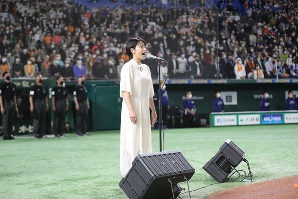 リニューアルした東京ドームではじめてスタートするシーズンの開幕戦という、特別な試合の前に国歌独唱を務めさせていただき、大変光栄でした。お客さんいっぱいの東京ドームはとても活気に満ちていて、これからはじまるシーズンやチームへの期待やワクワクが伝わってきました。とても緊張しましたが、会場の皆さんやテレビなどでご覧のファンの皆さんにも、届くように思いを込めて、歌いました。今年は「不屈」をスローガンに掲げる巨人軍の皆さんのエールとなれていたら、幸いです。