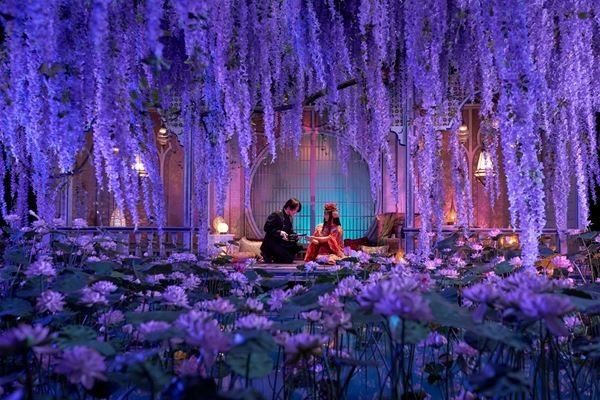 その他にも、エキゾチックなオレンジのワンピース、ベールで顔を隠したアラビアン風のコーデ、透け感のあるシフォン生地の袖と大ぶりのネックレス&ヘッドセットが神秘さを醸し出すコーデなど、現実離れした豪華絢爛な衣装が次々と登場。さらに、藤棚や蓮の花が咲き乱れる美しい<ミセ>のセットや美術、登場人物が使用する小道具など、細部に至るまでこだわりをもって作られている本作。特に侑子が使う煙筒は特注で制作されており、そこから煙が薫る様は優雅かつ幻想的で、監督の深いこだわりを感じさせるシーンとなっている。