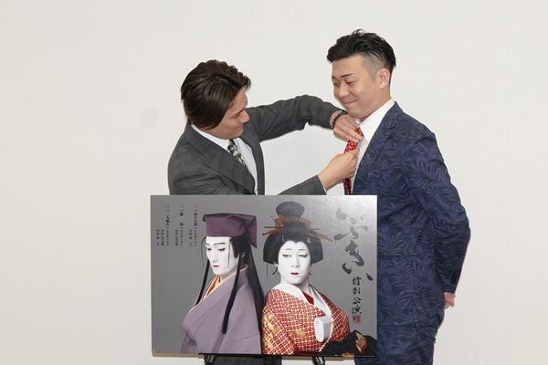 二人が共演する『二人椀久』は、幻想的な逢瀬を描いた人気演目で「諸先輩方の様々な名コンビで世界観が築かれてきた。ぜひ隼人さんと一緒に、僕たちだからこその世界を築き上げたい。同級生で、いろんなことを遠慮なく言えますし」(児太郎)、「幻想的で夢のような世界観が魅力。恋焦がれて、恋に狂った男の話ですから、児太郎君を愛しすぎて、演じられれば」(隼人)と深い“絆”に期待感。お互いの関係性を問われると、「いい意味でライバル視していたし、隼人さんが頑張れば、自分も頑張る。一番認めてほしいと思う人」(児太郎)、「継承の重圧に、真摯に向き合う姿を見て、僕も頑張らないといけないと思う。刺激をくれる存在で、彼がいなければ、今の僕もいない」(隼人)と全幅の信頼を寄せあった。写真撮影では隼人が、児太郎の曲がったネクタイを直してあげる微笑ましい場面もあり、早くも息の合った姿を見せていた。