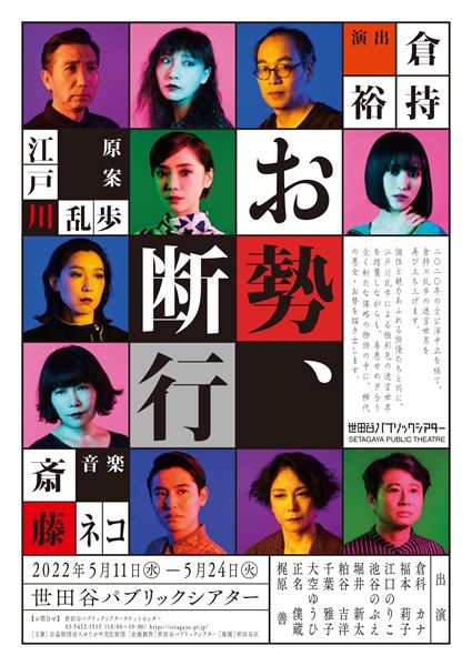 倉持裕演出による『お勢、断行』は2年前にゲネプロまで行ないながら、初日直前に中止となった作品であり、2年越しでついに上演が実現する。江戸川乱歩の短編「お勢登場」に出てくるお勢を主人公に据え、倉持がオリジナルで紡いだ物語であり、倉持は「稀代の悪女であるお勢を中心に、立場によって善悪が変わるということを描いています。まさにいま、コロナ禍にあって、それぞれがそれぞれの正しさを主張して様々な対立が生まれ、戦争も起きています。本来上演されるはずだった2年前よりも善悪を巡るテーマがより鮮烈に観客の目に映ると思います」と語る。