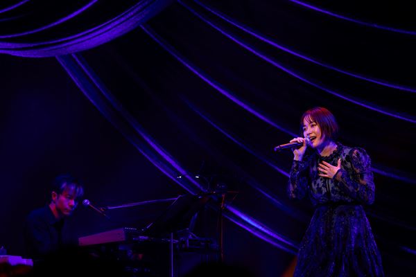 続く中盤パートではライブでは久々の歌唱となった活動初期の「頑張ったっていいんじゃない」。アッパーなポップソングも今回のアレンジで聴くと新鮮な雰囲気。6曲目が終わると「お聴きいただいた曲は「同級生」という楽曲でした。バイオリンとピアノでこの曲をやると絶対に合うだろうなと思って、お届けしました」。そして7曲目はデビュー映画『カノジョは嘘を愛しすぎてる』の挿入歌「卒業」をギター弾き語りで披露。「セトリクエストをやっていて、ずっと応援してくれている人が沢山投票してくれているのだなと感じたりしました。次の曲、私のことを知ったきっかけになった曲でもあるのではないかと思います」との紹介で高校サッカー応援歌として知られる「瞳」へ。