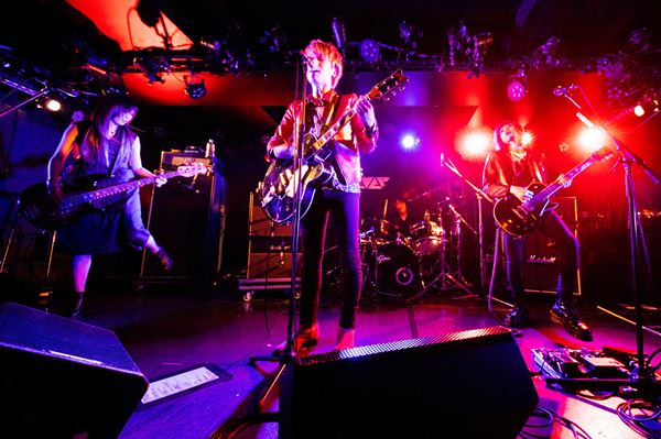 とにかく、しゃがれ気味のハイトーン・ボイスを放つ佐々木は、フロントマン然としてオーラに満ちており、アオキはクールな佇まいでギターはもちろんコーラスでも楽曲を援護射撃、さらにステージ上でステップを踏みながら骨太ベースで脇を支えるHISAYO、タイトかつパワフルなビートで土台をしっかりと支える渡邊と、キャラ立ち抜群のメンバーが一枚岩と化したサウンドは強力無比である。