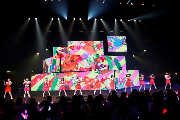 沖縄公演は、新型コロナ感染予防対策を徹底の上、「昼の部」「夜の部」の2公演を開催。大谷映美里がセンターを務める小悪魔でセクシーなダンスナンバー「Poison Girls」からライブはスタートし、代表曲「ウィークエンドシトロン」「ズルいよ ズルいね」はじめ、先日MVが500万回再生を突破し、TikTokで話題の佐々木舞香センター曲「しゅきぴ」「夏祭り恋慕う」ほか、MC無しで終盤まで19曲を畳みかけるように披露した。ステージ上に設置された3段のLEDモニターでは、当ツアーのために特別に制作・撮影された曲に合わせたCG演出やメンバーのドラマシーン、スペシャルなメンバー歌唱シーンなど、盛りだくさんの豪華演出がパフォーマンスと相まって、ステージ上を大いに盛り上げた。