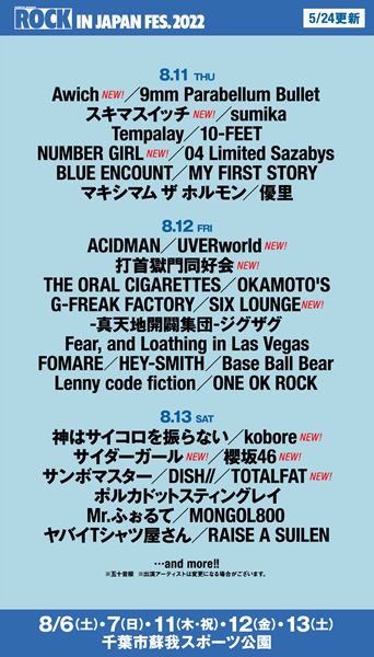 Awich / 9mm Parabellum Bullte / スキマスイッチ / sumika / Tempalay / 10-FEET / NUMBER GIRL / 04 Limited Sazabyz / BLUE ENCOUNT / MY FIRST STORY / マキシマム ザ ホルモン / 優里 / and more...