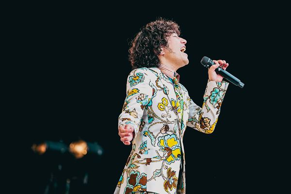 歓喜と感謝に溢れた「笑えれば V」では優しいコーラスワークで包み込み、「愛撫ガッチュー V」ではマラカスを手にエモーショナルに歌い上げ、「事件だッ! V」では再びダンサーが合流し、総勢50名近くが入り乱れる圧巻のパフォーマンス! 「いや~すごい! ダンサーのみずみずしさ(笑)。負けへんで~! お客さんもめちゃめちゃみずみずしいよ、ピチピチ(笑)。これも何度となく演奏してきた、若さみなぎるラブソング!」(トータス松本)と告げた「いい女 V」では、アウトロでいち早くはけたトータス松本を横目に、「みんなー! トータスに会いたいかー!?」とあおるジョンB。手拍子に呼び戻されたトータス松本が帰還し、最高潮の熱気のまま前半戦が終了した。