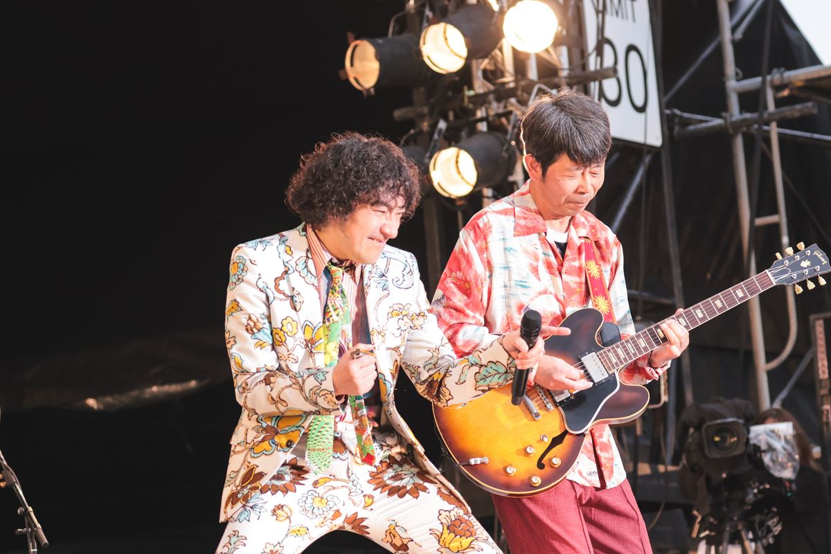 気を取り直して、イントロのギターリフとピタリと合わせ「カモン、トータス!」と呼び込むジョンBの掛け声を合図に、せり出しから浮上したトータス松本の「大阪ー!」コールで、場は一気に盛り上がる! そう、1曲目からいきなりの「ガッツだぜ!! V」。総立ちのもみじ川芝生広場に数万の手が伸びる中、真心ブラザーズの桜井秀俊(G)と菅原龍平(G)の魂のギターソロの掛け合いでも魅せ、そのまま「サンキュー・フォー・ザ・ミュージック V」へ。武嶋聡(Sax)、村上基(Tp)、滝本尚史(Tb)からなるヤッサホーンズと伊東ミキオ(Key)のピアノも映える一曲に、あっという間に最高のライブ空間が出来上がる。トータス松本が「マスクの中で一緒にカモン! 小っちゃい声で(笑)」と促した「すっとばす V」といい、“30周年で30曲”と宣言した代表曲の数々を序盤から惜しみなく披露していく。