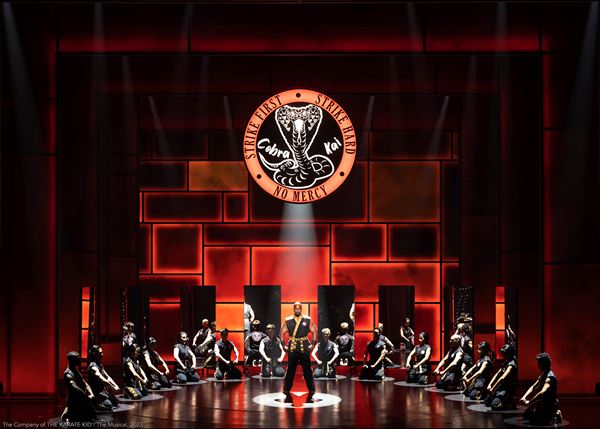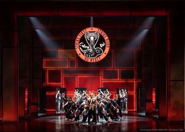 舞台中央の黒松の盆栽に、スポットライトが当たっている。障子を思わせるスクリーンと桟で仕切られた背景の中央に、その美しい枝振りのシルエットが映り、中から化身のような5人のダンサーが登場すると、たちまちスピリチュアルな空気が舞台を満たした。一転して、塞ぎ気味なダニエル少年と息子に手を焼く母ルシールの会話で、映画版でなじみのある世界が始まり、やがてコブラを描いたアイコンとともに黒い道着の猛者たちが勢揃いするコブラ会道場が現れると、客席からは怒濤の大歓声。空手の型を取り入れた力強くもクールな演武的ダンスシーンではしばらく拍手が鳴り止まず、文字通りショーストッパーとなった。こうした印象的なダンスシーンの数々と可動パネルを駆使したハイスピードの場面転換では、アンサンブルキャストが大活躍。新鋭ドリュー・ガスパリーニの親しみやすくツボを心得た楽曲も、多大な貢献を果たしていた。