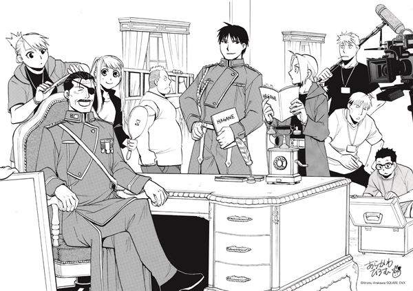 公開2週目の7月1日~3日の第2弾は、敵味方関係なく映画撮影に臨む原作のキャラクター達による撮影の合間の1コマを描いたイラスト。作中では大総統という設定もあり、にこやかな表情を浮かべることがほとんどないキング・ブラッドレイの貴重な笑顔のオフショットや、慣れた様子でブラッドレイのヘアメイクを直すリザ・ホークアイ中尉、台本を片手にどうやらこの後の演出や流れについて打ち合わせしているであろうエドとロイ・マスタング大佐など、まさに原作×映画と呼ぶにふさわしい各キャラクターの貴重な姿が描かれている。