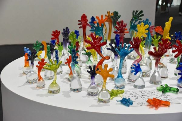 見どころの一つは、手をモチーフにした「REACH OUT」シリーズ。中でも、大量にカットしたステンレスを溶接でつなげた《REACH OUT TOWER》は、浜野製作所(墨田区)の協力で生まれた作品だという。