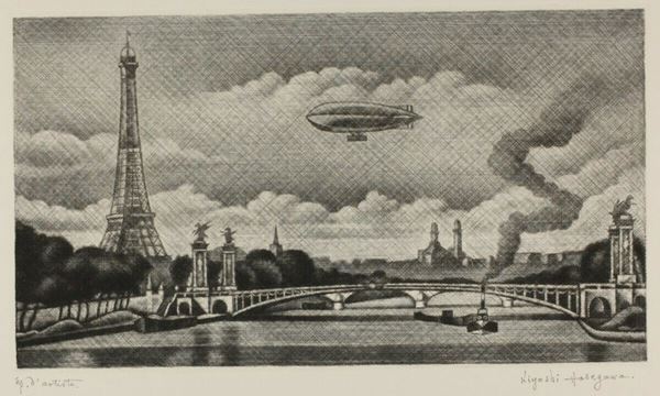 長谷川潔《アレクサンドル三世橋とフランスの飛行船》1930年、町田市立国際版画美術館蔵
