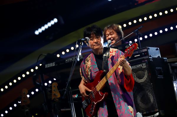 彼らの幅広い音楽を一通りなぞったと思えるこのタイミングで、根本は「そろそろ飽きてきてませんか? いや、俺たちは平気だよ。そもそもやれる曲を全部やろうと企画したライブだし」と客席に笑いかける。しかし返ってくる拍手は「私たちも平気」と答えているよう。そこからは前半最後のコーナー“歌い回し”。メンバー間で歌い繋ぐ曲を連ねていく。「Rock'n Roll Blues」「銀座(あらため大阪)ネオン・パラダイス」「恋は医者でも治せない」、そしてサンバのリズムに乗せて全員がステージ前に展開して踊る「オラが鎮守の村祭り」(※東西共通曲)。ここまでで約3時間。26曲を演奏し終えて、30分間の休憩となった。