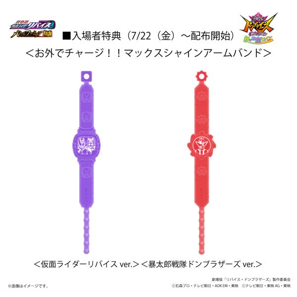 そして、映画の入場者特典も発表された。映画公開日から、全国の劇場で<先着30万人限定>で配布される入場者特典「お外でチャージ!!マックスシャインアームバンド」に決定。仮面ライダーリバイスver.と暴太郎戦隊ドンブラザーズver.の2種類あり、入場時にランダムで配布される。