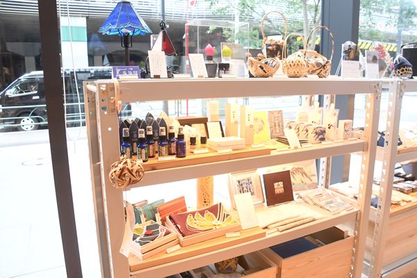 それぞれ「乾杯」=各地のお酒や酒器、おつまみや調味料、「宴席」=大分、福岡、佐賀、沖縄の特色ある器、「彩り」=お香や風鈴など、宴の時間・空間を五感で楽しむ品、「装い」=宴に出かけるときの華やかなアクセサリーや洋服、「お祭り」=下駄や花火、郷土玩具など夏の宴を盛り上げる品々、「贈り物」=有田焼のカップや酒や、点字レターセットなど、「余韻」=お茶やお菓子など宴を締める商品、とテーマづけられた棚には、彼女たちが数十日をかけて現地に赴き、じっくりと吟味した個性的な品々が並ぶ。総点数は350点にも及ぶ。