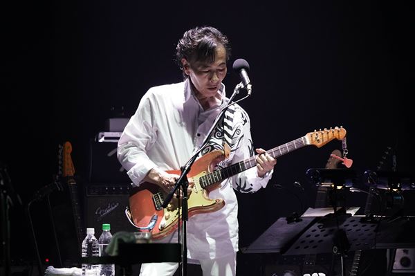 レアな選曲の連打で客席を大いに沸かせたゲストコーナーが終わると、再びSKYEのメンバーの演奏に戻る。鈴木茂から「『風街ろまん』(1971) を作るときに、松本隆さんから詞を頂いて書いた曲です。ライブでは何回か演奏してましたが、録音することはなかった曲です」とギターを弾きながら歌ったのは、はっぴぃえんどの未発表曲「ちぎれ雲」。50年の時を経て今回のSKYEのアルバムで初めて録音された幻の曲だ。
