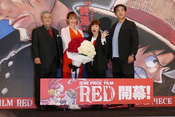 『ONE PIECE FILM RED』の初日舞台挨拶が8月6日、丸の内TOEIで行われ、主人公・ルフィを演じる田中真弓、シャンクス役の池田秀一、本作のヒロイン“ウタ”役を担当する名塚佳織、谷口悟朗監督が登壇した。