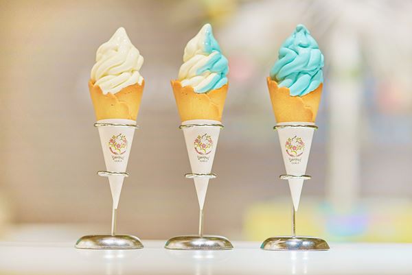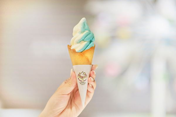ブーケソフトは、バター風味のサブレ生地を使用したコーンにソフトクリームを花びら形に盛ったもの。コーンも花束をイメージしたデザインで、ミルク、フラワーフレーバー、ミックス(ミルク×フラワーフレーバー)の3種類から選ぶことができる。フラワーフレーバーは、北海道ソフトクリームをFLOWER(花)のフレーバーシロップで色づけたもので、現在は見た目にも涼しい“青バラ”が使用されているが、今後は季節でフレーバーが変更される予定だ。
