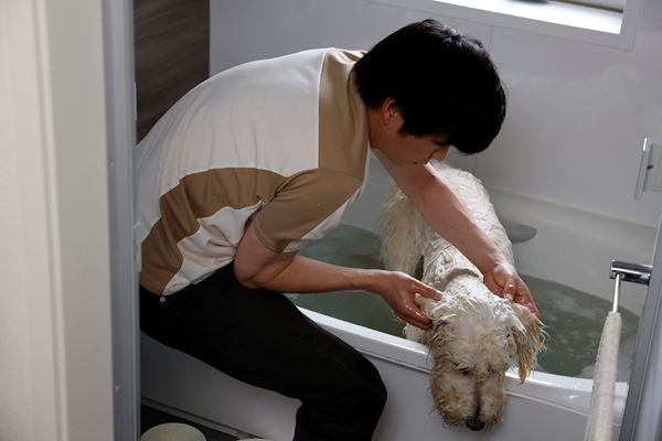 この度解禁となった映像では、映画全編に渡りナレーションを担当する石田ゆり子のナレーション「民夫とその犬は出会った」から始まり、ハウを迎えたばかりの民夫家の日常が映し出される。部屋中を駆け回るハウに苦労してリードを付けたかと思いきや、散歩中もハウに引っ張られながらついていくのに必死の民夫。ネットの動画を参考に手探りでハウの体を洗っていたかと思えば、水を払おうと全身を震わせるハウによって民夫の方がびしょ濡れに! 元気いっぱいのハウに振り回されてばかりの民夫だが、最後にはキュンとする微笑ましいシーンも。