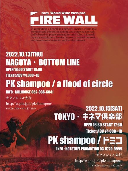 すべて見るPK shampooが、10月13日に愛知・ボトムライン、10月15日に東京・東京キネマ倶楽部で開催する新たな自主企画『From World Wide Web pre.「FIRE WALL」』のゲストアーティストを発表した。