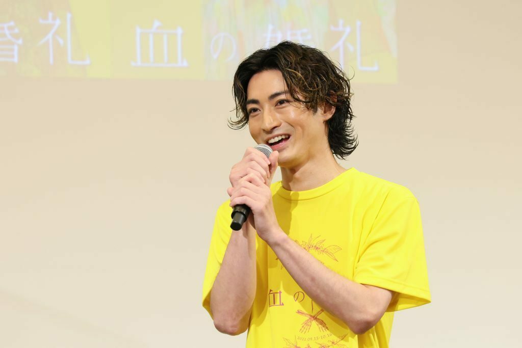 会場となる東京會舘のステージに、お揃いの『血の婚礼』Tシャツを着て登場した5人。昨日急遽MCに指名されたという須賀健太が「僕だけ(Tシャツの上に)ジャケットを着てきて、輪を乱してすみません」と挨拶する。慣れないMCに懸命に取り組む須賀に対して木村達成、早見あかり、安蘭けいが次々にツッコミを入れてゆく。早見は「ご覧のとおり、陽キャの集まりです」と観客に伝えた。