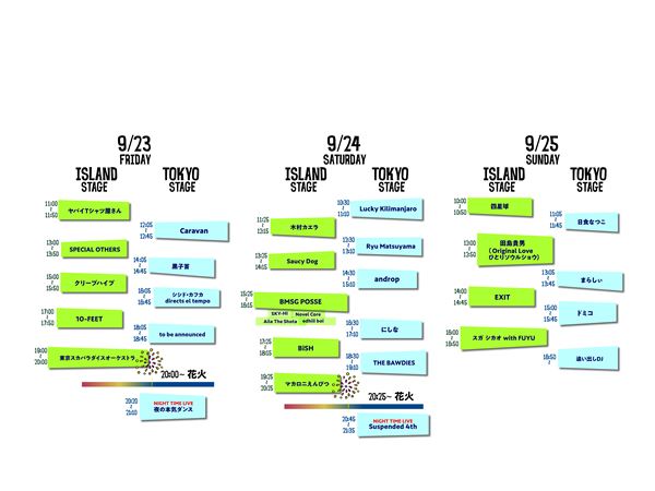 今回出演がアナウンスされたのは、夜の本気ダンスとSKY-HI率いる「BMSG POSSE(SKY–HI・Novel Core・Aile The Shota・edhiii boi)」の2組。なお23日と24日は、ヘッドライナーのライヴ直後から花火が打ち上げられる予定だ。