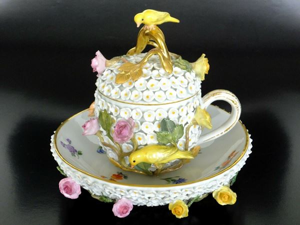 マイセン《貼り付け花鳥とスノーボール蓋付きカップ&ソーサー》1860-1880年