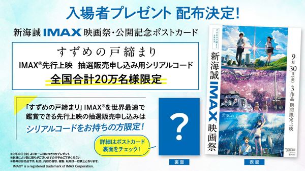 また、『新海誠IMAX映画祭』では、特典のシリアルコード付きポストカードが全国合計20万部限定で配布される。ポストカードの表面は『新海誠IMAX映画祭』のポスタービジュアルと同じデザインになっており、ここでしか手に入らない貴重なもの。シリアルコードは11月7日(月)19:00より開催される『すずめの戸締まり』世界最速IMAX上映の抽選販売応募の際に必要な重要アイテムとなっている。