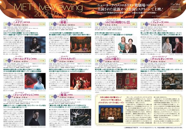 気になる日本での「METライブビューイング2022-23シーズン」上映開始は、2022年11月25日(金)。新シーズンにおける選りすぐりの10演目が、東劇・新宿ピカデリーほか、全国の映画館において順次上映開始される。