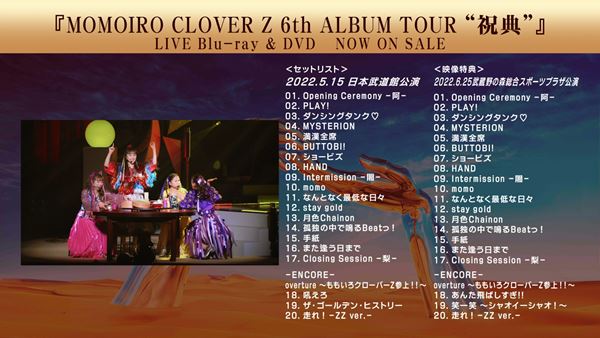 『MOMOIRO CLOVER Z 6th ALBUM TOUR “祝典”』は、最新アルバム『祝典』を引っ提げ、約4年ぶりに開催されたライブツアー。セットリストはアルバムの収録順となり、アーティスト写真でも着用している煌びやかな衣装や担当カラーを取り払った白を基調とした新衣装などで、アルバムの世界観を表現したコンセプチュアルな内容となっている。9月14日に発売された今作には、5月15日の東京・日本武道館公演と、ツアーファイナルとなる6月25日の東京・武蔵野の森総合スポーツプラザ公演の模様が収められている。