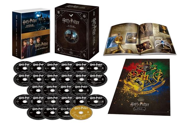 このBOX だけで『ハリー・ポッター』シリーズから”同窓会”についても全作を楽しむことができるほか、26枚組の豪華BOXとなっており、36ページのイメージブックレットとグリフィンドール、ハッフルパフ、レイブンクロー、スリザリン各寮の紋章がひとつにデザインされたミニポスターも付属となっている。
