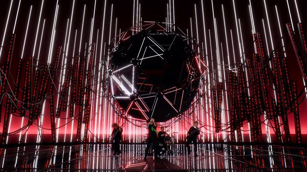 XR、バーチャルプロダクションシステムを使ったライブとはどういうものか。LEDヴィジョンに映像を投影する演出は、多くのライブやオンラインライブでもおなじみだが、このシステムではそこにバーチャルを融合してリアルタイムで仮想空間を構築していく。筆者はライブのゲネプロに立ち会わせてもらったが、目の前では床と背面がLEDヴィジョンのステージでSiMが演奏を繰り広げるなか、モニターに目をやるとそこには目の前の光景にはない空間の中でSiMが演奏をしており、頭が混乱してしまいそうだった。が、リアルなライブの醍醐味とはまた違った曲ごとに別世界に飛び込んでいくような幻惑的な体験は、SiMというバンドの持つ魅力そのもので面白い。