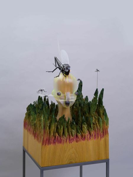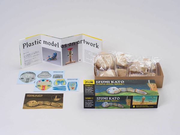 今回は、コロナ禍でスタジオにいる時間が長くなり、子供の頃から好きだったプラモデルを作るうちに展開した新作などを発表する。自身が手がけた木彫に、動物や昆虫のプラモデルをコラージュして(組み合わせて)みると「プラモデルが作品に寄生して、面白いことになった」という。また、フィギュアやプラモデルの制作会社『ゴモラキック』の神藤政勝と意気投合し、石のプラモデルを制作。デカール(表面に転写する)の絵や箱、組立て説明書もすべて加藤が作っている。