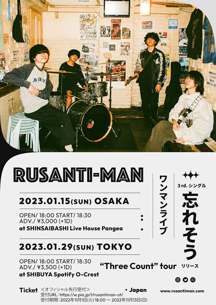 併せて、リリースを記念したワンマンライブ『"Three Count" tour』を1月15日(日) に大阪・心斎橋 Live House Pangea、1月29日(日) に東京・渋谷 Spotify O-Crestにて開催することも決定。ルサンチマンがワンマンライブを行うのは、東京では今年8月に開催されたフロアワンマンライブ以来となり、大阪では今回が初のワンマンライブとなる。チケットは現在、オフィシャル先行を受付中だ。