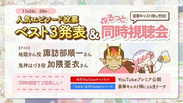 すべて見るイラストレーター・カナヘイがキャラクター原案を務めるTVアニメ『ちみも』の人気エピソード3つが、YouTube松竹チャンネルにて無料配信されることが決定した。また、副音声として楽しめるTwitterスペース配信に、本作で声優を務める諏訪部順一と加隈亜衣が生出演することが発表された。