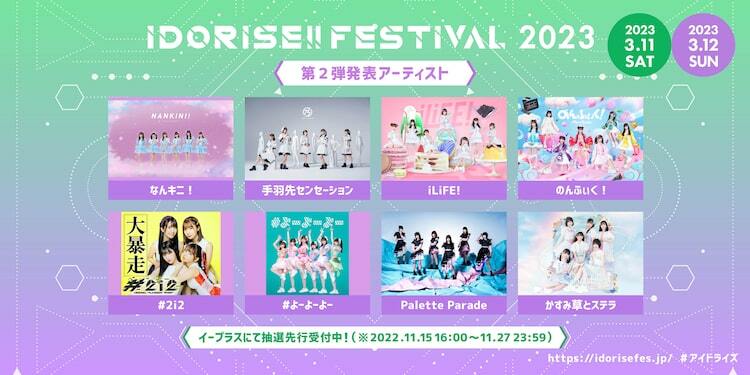 「IDORISE!! FESTIVAL」はシブヤテレビジョンが主催するイベントで、今回が4度目の開催となる。この発表でなんキニ!、手羽先センセーション、iLiFE!、のんふぃく!、#2i2、#よーよーよー、Palette Parade、かすみ草とステラの8組の出演が明らかになった。出演アーティストは今後も追加される。イープラスでは2DAYSチケットと、VIPチケットの抽選先行予約を11月27日まで受付中。