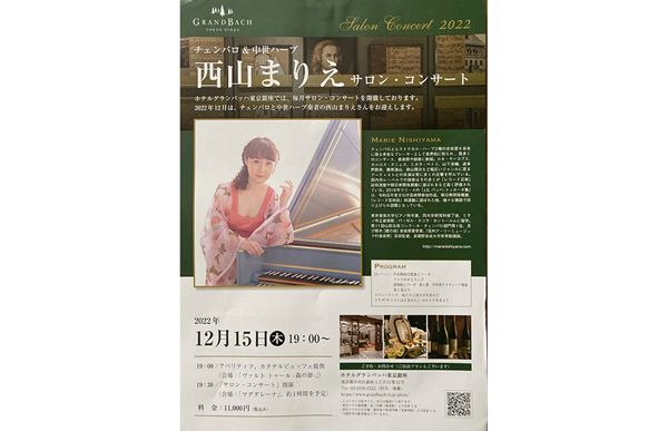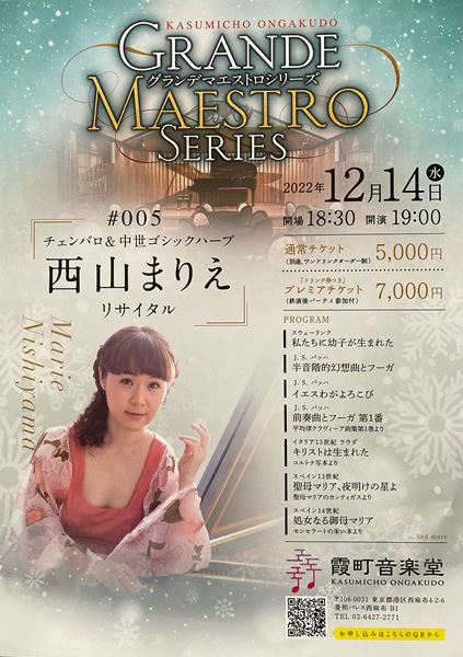 「今回はクリスマス時期ですので、中世からバロック時代にかけて、イエス・キリスト生誕を祝う作品や優美で清らかなる聖母マリアの讃歌、そしてバッハの名曲プログラムを、チェンバロと小さな中世ハープでお聴きいただきます。街並みの煌びやかなイルミネーションと共に、この季節ならではの音楽を、ワインやお飲み物など片手にお楽しみいただけましたら幸いです。西麻布の霞町音楽堂とグランバッハ東京銀座。魅力溢れるふたつの優雅なサロン・コンサートをお楽しみください(西山まりえ)」