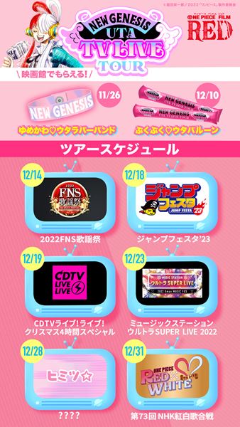 歌姫・ウタが歌う主題歌・劇中歌全7曲が数々の音楽チャートを賑わせ、ウタの「歌ってみた」「踊ってみた」動画がSNSに数多く投稿されるなど、空前のウタブームを巻き起こした『ONE PIECE FILM RED』。同番組には、歌番組やイベント出演からなるツアー『UTA TV LIVE TOUR』の全6公演のDAY4として登場する。