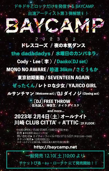 『BAYCAMP』はBAYCAMP実行委員会が主催するオールナイトロックイベント。これまでCody・Lee(李)、MONO NO AWARE、東京初期衝動、SEVENTEEN AGAiN、レトロな少女、ルサンチマン、DJダイノジ、DJ FREE THROW(弦先誠人 / 神啓文 / タイラダイスケ)、ドレスコーズ、夜の本気ダンス、YAJICO GIRLの出演が発表されている。