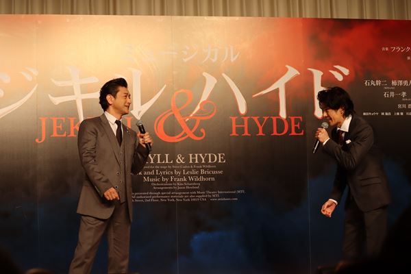 ミュージカル『ジキル&ハイド』製作発表より、歌唱披露後の石丸幹二(左)と柿澤勇人(右)