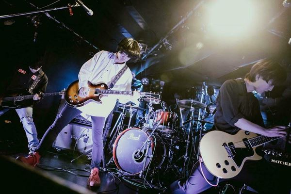 「次は踊れる曲を」と言って始まったのは『THINK!THINK!THINK!』。一定のリズムを刻むベースとドラムの上に、ディレイを盛り込んだ不思議なギターの音が乗る。誰がどういうことをやっているのか観客にはよくわからない。ある意味カオスな演奏がタイトルの通り、考えて考えて考えて、ごちゃつく頭の中を表現しているようだった。続く『under』は歪むベースの音から。クワエ(Ba)は首を振って勢いよくベースを鳴らし、オオエ(Dr)は荒々しく叩く。真ん中に集まって3人でかき鳴らした。最後の1曲は『むかしむかし』。丁寧に響く轟音の中に優しさ、懐かしさを感じる。聴く人がそれぞれ自分の持つ思い出に浸ることのできるような美しい曲だった。