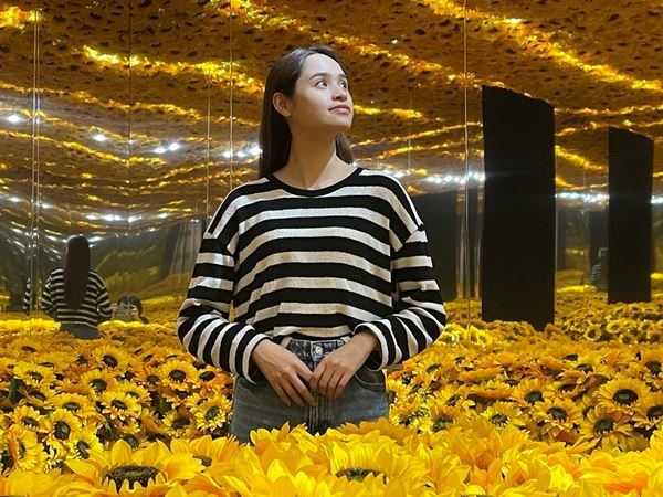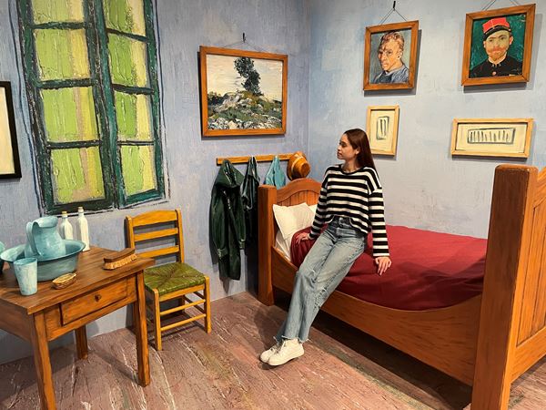 入口すぐ出迎えられたのは名作《星月夜》の絵の中に飛び込んだような光のカーテン。そこを抜けると、ゴッホの経歴や残した絵画の紹介、そして撮影スポットだ。ゴッホが自らの寝室を描いたとされる絵を立体化、ベッドに座って撮影することができる。またゴッホが何度も描いた「ひまわり」を一面に咲かせた部屋も。そこでは、ARを使用するとスマホ画面の中にイラストのゴッホさんが現れて、一緒に撮影することも可能だ。